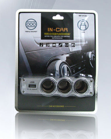 Triple Car Cigar Lighter Socket Splitter with USB Port, 3 Way Socket DC Lighter adaptor with USB Port.Convert and Increase your car DC lighter from 1 to 3 sockets with one additional USB port. Simply plug into car's DC lighter socket. Run multiple accessories at one time. Very convenient and easy to use. This fascinating car accessory is designed to exigence charging for the DC 12V and DC 5V device. Three sockets provide the power to 3 applications at the same time. But the most important application is USB. The USB charger output offer the power to tablet, phone, GPS, IPOD, PDA, MP3/MP4 player, camera, PSP etc when you are traveling. Device Type: 3 Socket Car Charger + USB Port. Input 12V. Cable length: 3 feet (90 cm).Share