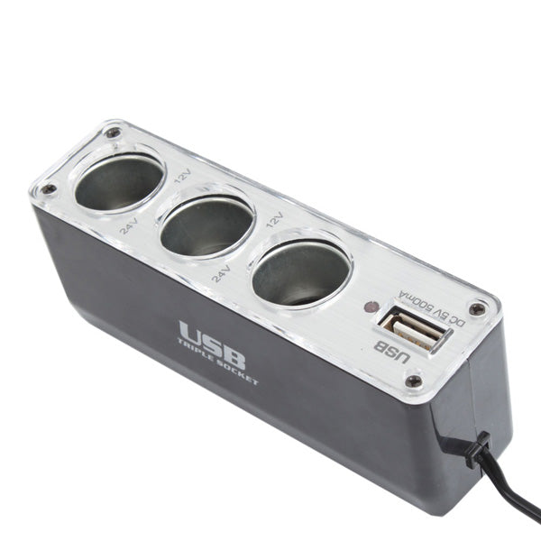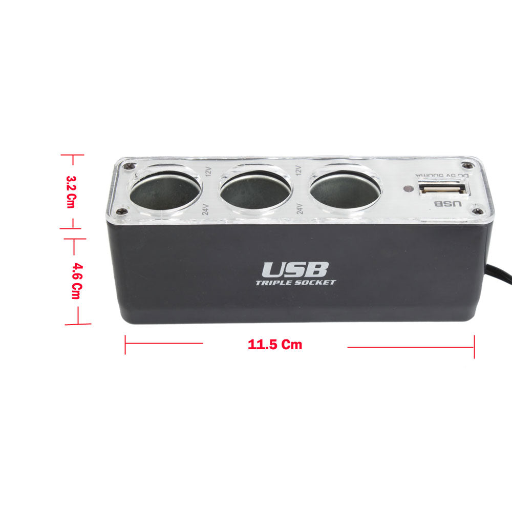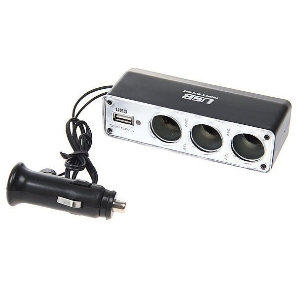 Triple Car Cigar Lighter Socket Splitter with USB Port, 3 Way Socket DC Lighter adaptor with USB Port.Convert and Increase your car DC lighter from 1 to 3 sockets with one additional USB port. Simply plug into car's DC lighter socket. Run multiple accessories at one time. Very convenient and easy to use. This fascinating car accessory is designed to exigence charging for the DC 12V and DC 5V device. Three sockets provide the power to 3 applications at the same time. But the most important application is USB. The USB charger output offer the power to tablet, phone, GPS, IPOD, PDA, MP3/MP4 player, camera etc when you are traveling. Device Type: 3 Socket Car Charger + USB Port.Share